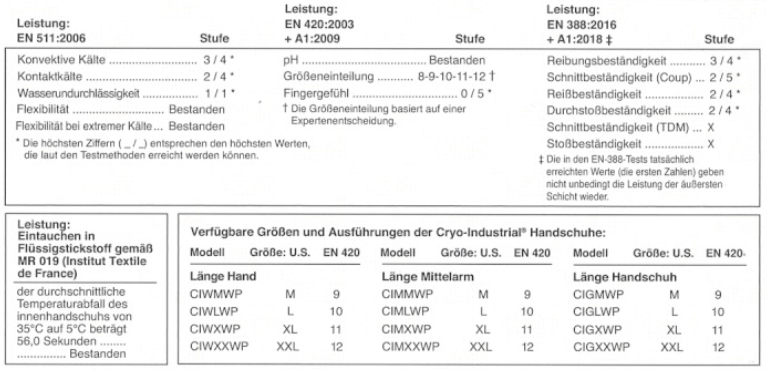 Die Schutzhandschuhe sind besonders für den industriellen Einsatz geeignet und durch die spezielle Innenfläche des Handschuhs widerstandsfähig und robust. Unübertroffener Schutz gegen die Gefahr bei Arbeiten in Ultra-Tieftemperaturen und zum Einsatz, bei dem Abriebfestigkeit, Haltbarkeit und Griff-Festigkeit gefordert sind.Der Innenhandschuh besteht aus drei Schichten: zwei Isolierschichten und einem Futterstoff. Zwischen der äusseren Schicht und den Isolierschichten ist als zusätzlicher Schutz ein 100% wasserdichter, nahtloser Innenhandschuh eingearbeitet.NUR noch in der Größe Medium (9), erhältlich!Achtung: Nicht geeignet zum Eintauchen in Flüssigstickstoff oder andere kryogene Flüssigkeiten!