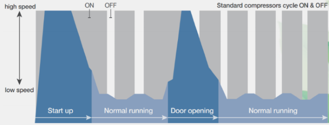 Die V-Drive-Technologie (im Gegensatz zu herkömmlichen Kompressoren)passt sich den Gegebenheiten an wie Inbetriebnahme des Tiefkühlschranks oder Türöffnungen, wenn also eine höhere Kompressor-Leitstung erforderlich ist. Beinormalen Betrieb des Tiefkühlschranks (geschlossenene Tür) läuft der Kompressor mit niedriger Leistung um die Sollwerte einzuhalten.